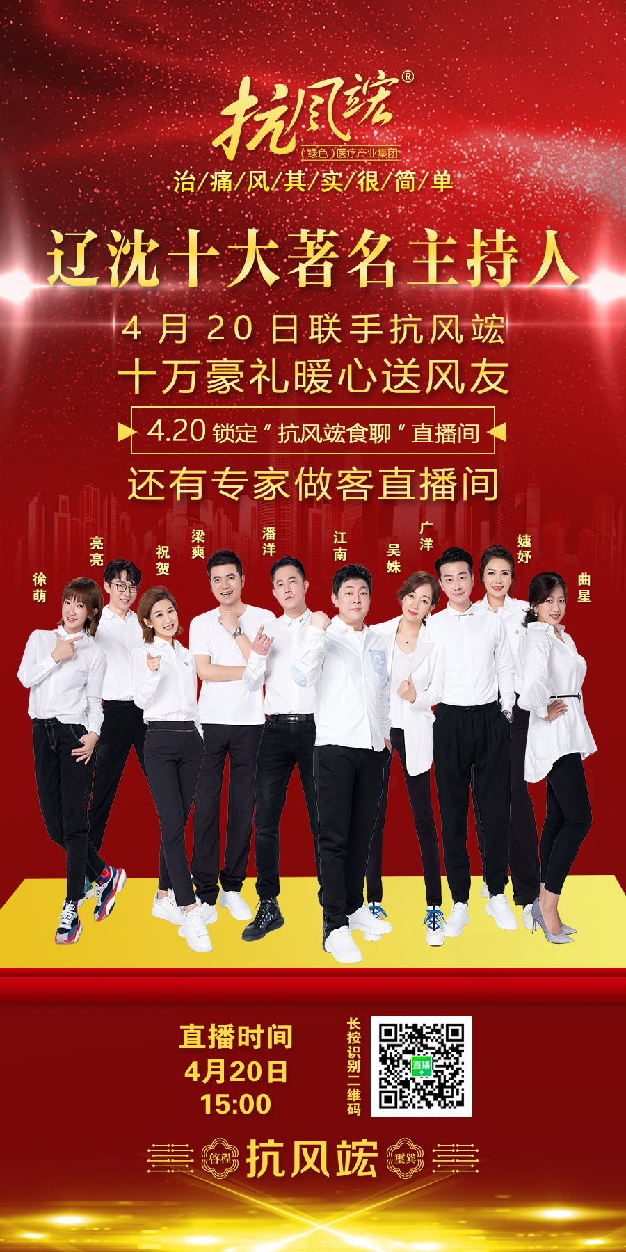 活動當天,有播、騰訊直播、抖音等多家直播平臺將對活動進行全程直播,遼沈地區十大著名主持人吳姝、祝賀、江南、潘洋、梁爽、曲星、婕妤、廣洋、亮亮、徐萌等悉數來到沈陽抗風竤中醫門診,與抗風竤醫療產業集團董事長張汭鈞、總裁程莉琂共同啟動全國十大“抗風斗士”評選活動,同時為全國各地的痛風患者傾情獻愛心,十萬豪禮大放送。