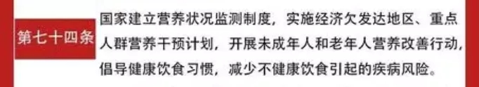 第七十四條:國家建立營養(yǎng)狀況監(jiān)測制度,實施經濟欠發(fā)達地區(qū)、重點人群營養(yǎng)干預計劃,開展未成年人和老年人營養(yǎng)改善行動,倡導健康飲食習慣,減少不健康飲食引起的疾病風險。