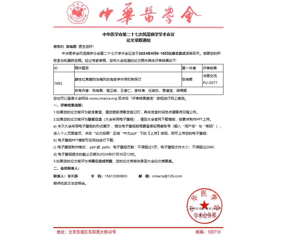 我院在本次大會上一次性被收錄兩篇論文,這無疑是一項令人矚目的成就。不僅是對我院團隊科研能力的認可與肯定,更是標志著我院在痛風學領域的科研成果取得了新的突破。
