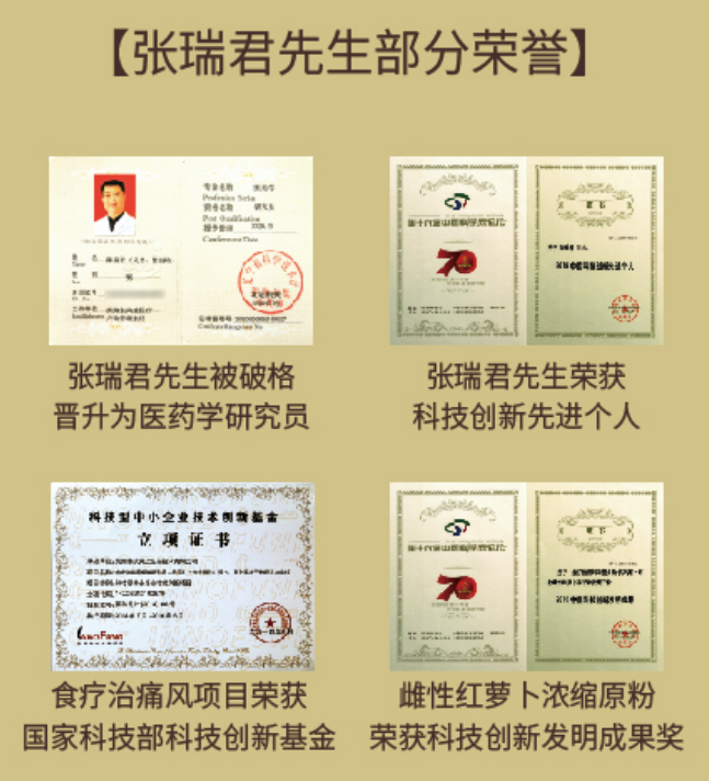 品種發明人張瑞君先生,1995年隨父親開展東北雌性紅蘿卜(雌性紅萊菔)優良品種的選育工作,期間對蘿卜(萊菔)的食療作用產生濃厚興趣,并查閱大量古代醫藥典籍;2007年底發現東北雌性紅蘿卜對痛風、高血脂、高血壓等疾病有很好的食療作用;從2008年至今,一直專注于東北雌性紅蘿卜抗痛風、抗腫瘤等作用機理研究和臨床推廣事業,17年來帶領科研團隊取得科研成果16項、申請發明專利12項,發表論文19篇,參加全國性學術會議8次,榮獲國家科技部科技創新基金、中國科技創新發明成果獎。
